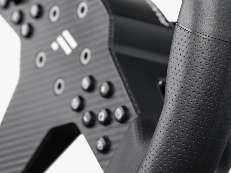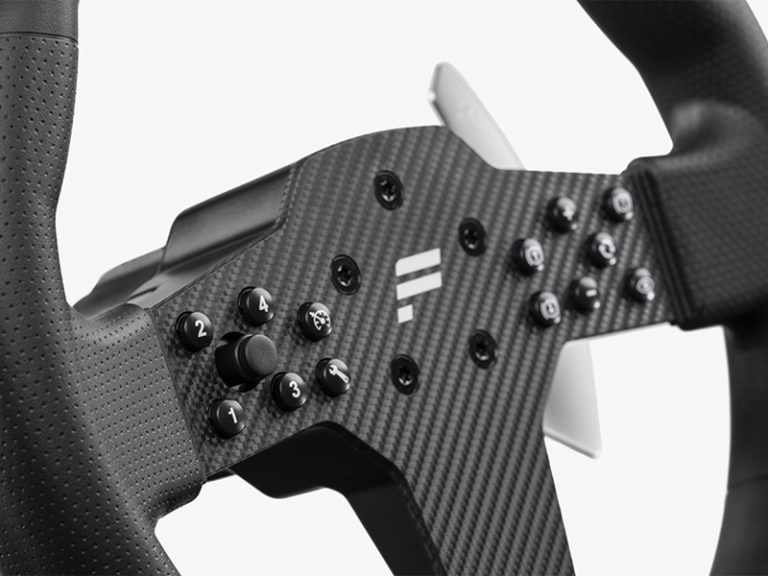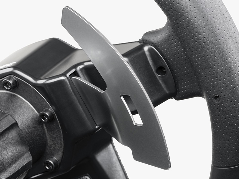The 12 buttons on the face of the wheel are positioned in a way that allows you to find the right input by feel and muscle memory. The metal shifter paddles are snap-dome assisted for a positive “click” feeling.