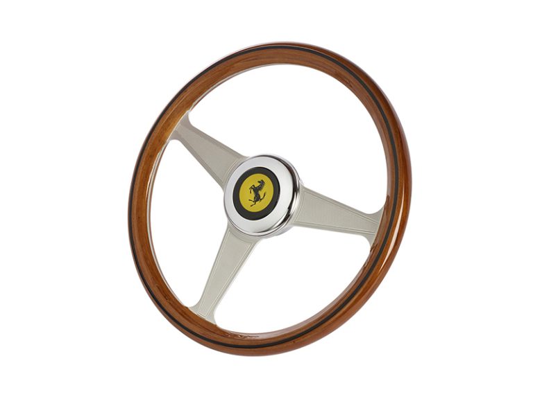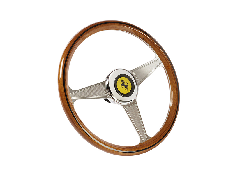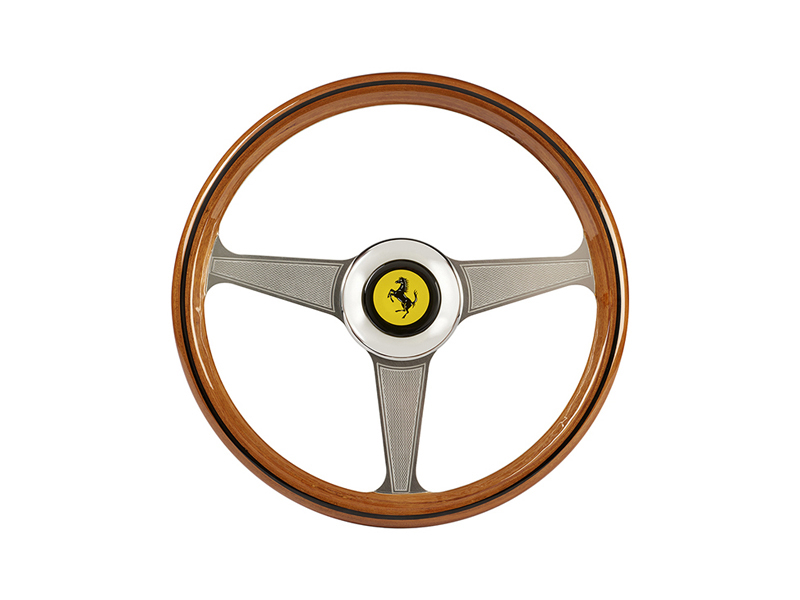 Designed with top-grade materials including a sturdy metal frame (both sides of which are covered with a genuine wood finish), a real chrome logo plate and an eye-catching metal faceplate, this sumptuous 8:10 scale replica measures 13”/33 cm in diameter, for total immersion in the Ferrari brand’s rich history.